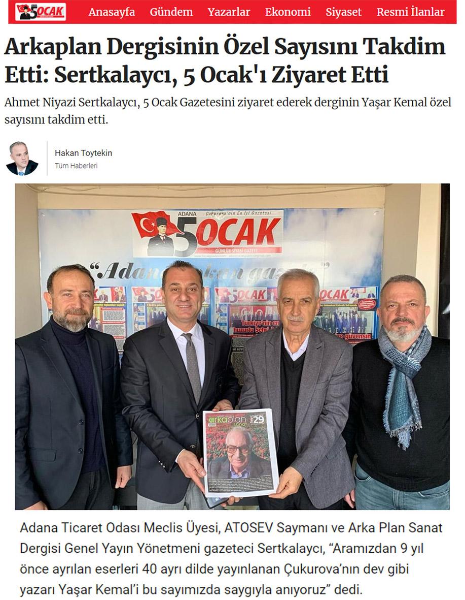 Arka Plan Sanat dergimizin Genel Yayın Yönetmeni A.Niyazi Sertkalaycı Adana’mızın önemli gazetelerinden olan 5 Ocak’ı ziyaret ederek Yaşar Kemal özel sayısı ile ilgili bilgi verdi. Nazik misafirperverlikleri için 5 Ocak ailesine teşekkür ederiz…