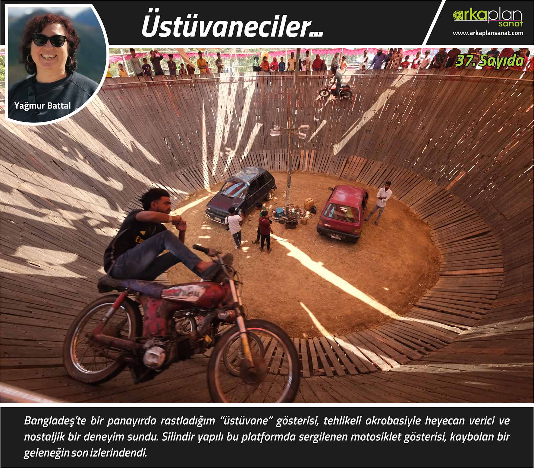 Bangladeş’te bir panayır alanında karşılaştığım “üstüvane” gösterisi beni yıllar önce sözlükte rastlayıp unutmaya yüz tuttuğum bir kelimeyle yeniden buluşturdu. Silindir biçimindeki ahşap platformda motosikletçilerin dikey duvarlarda akrobasi yaptığı bu heyecan verici gösteri, aslında zamanla unutulmaya yüz tutmuş bir gelenek. Sıcak havaya ve teknolojinin etkisine rağmen cesur sürücülerin sergilediği performans, hem fizik kurallarını hem de insan sınırlarını zorlayan bir deneyimdi.