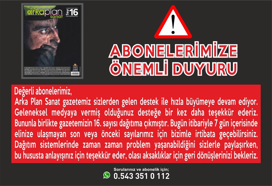 Abonelerimizin Dikkatine!..Kültür, sanat, gezi rehberiniz Arka Plan Sanat’ın dağıtımında son bir hafta….Soru ve abonelik işlemleri için 0.543 351 0 112